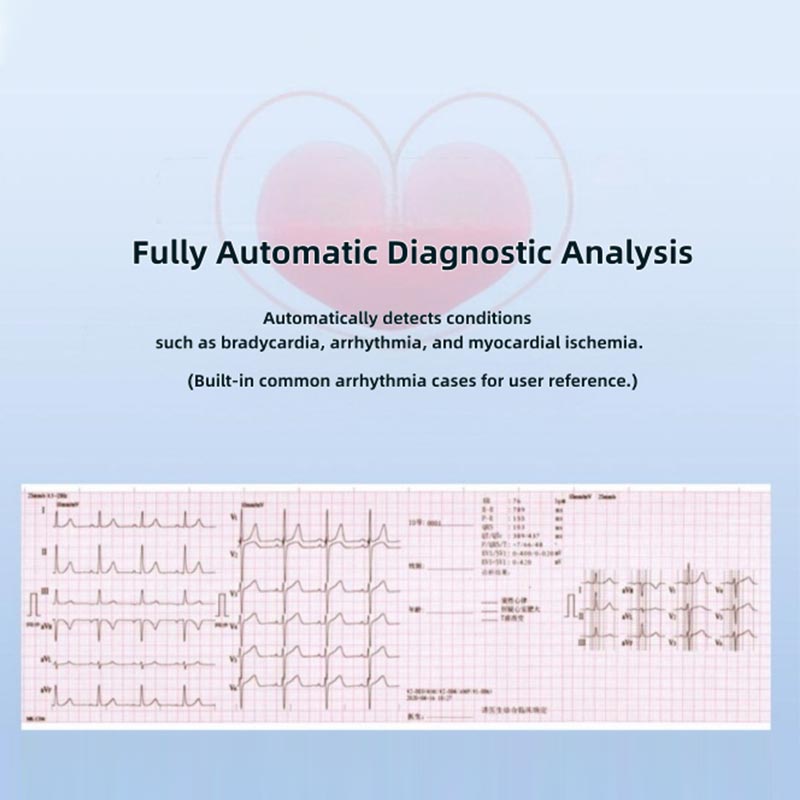 3. HTSY® elektrokardiográfunk automatikus pulzusméréssel és intelligens elemzési funkciókkal rendelkezik, így kiválóan alkalmas napi klinikai diagnosztikára. Professzionális, klinikailag tesztelt elektrokardiogramot használ elemző algoritmusok, amelyek pontosan képesek rögzíteni a szív elektromos jeleinek finom változásait, automatikusan különböző rendellenes szív elektromos jelek azonosítása, gyors pontos pulzusmérési eredmények biztosítása és a teljes előzetes elemzési jelentést, így nincs szükség az egészségügyi személyzetnek a manuális kiszámítására és elemzésére hullámformák. Ezenkívül a gép előre tartalmazza a gyakori klinikai aritmiák különféle tipikus eseteit, ami megkönnyíti Az egészségügyi személyzet a diagnózis során bármikor hozzáférhet hozzájuk és hozzájuk fordulhat, segítve őket abban, hogy pontosabb ítéletet hozzanak a beteg állapota.